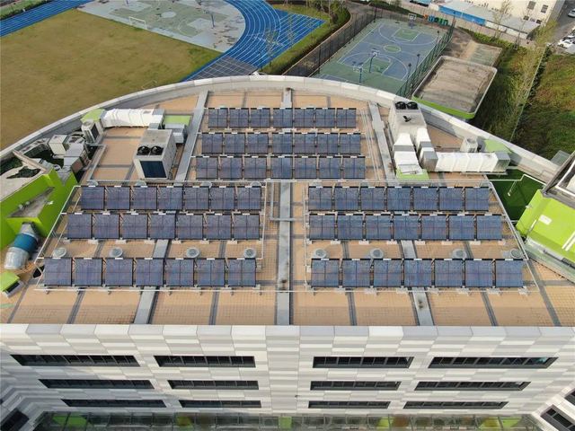 ——室外運(yùn)動(dòng)場(chǎng)雨棚屋面由太陽能光伏發(fā)電板組成,既能夠發(fā)電也能夠遮風(fēng)擋雨。部分屋面也建有真空管太陽能熱水系統(tǒng),太陽能熱水可供廚房使用。