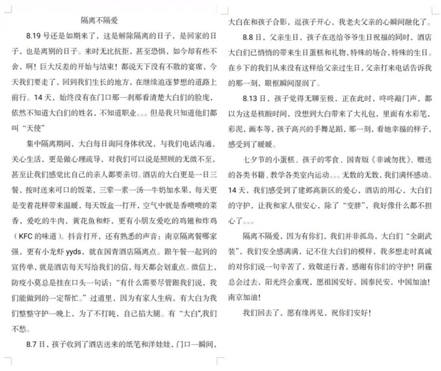 集中醫(yī)學(xué)觀察即將結(jié)束前,酒店工作人員收到了一份飽含深情的離別“禮物”。這是一封來(lái)自剛剛結(jié)束觀察生活、離開(kāi)酒店順利歸家的市民朋友的感謝信,他用樸實(shí)真摯的語(yǔ)言回顧了與家人在酒店里生活的點(diǎn)點(diǎn)滴滴,表達(dá)了對(duì)集中觀察點(diǎn)指揮部、各工作組及國(guó)青酒店的感謝與祝福。