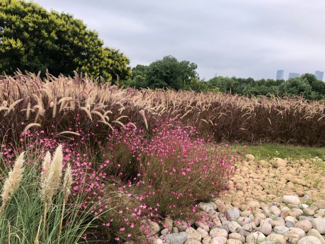 紫金文創(chuàng)園屋頂花園提升項目將植物配置進(jìn)行全面提檔升級,把原有枯黃退化、高低不平的狗牙根草地進(jìn)行翻新整地,栽植了薄雪萬年草,紅葉景天,粉黛亂子草、紫穗狼尾草等灌木和草本植物,既保證了屋頂承重的要求,又形成了野趣的屋頂景觀效果。