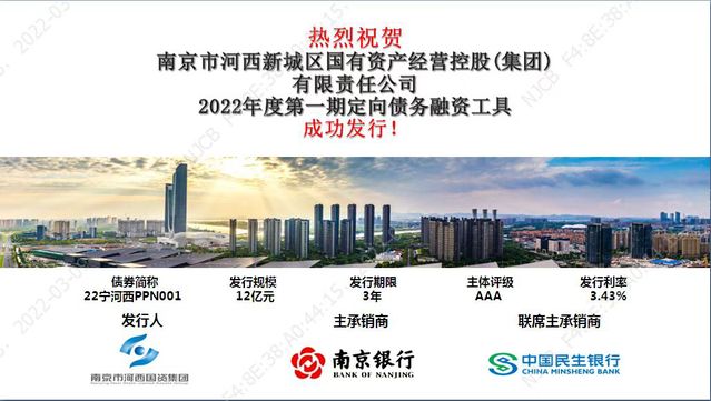 本次債項(xiàng)發(fā)行在主承銷商南京銀行,聯(lián)席承銷商中國民生銀行的共同努力下成功首發(fā)12億元(債券簡稱:22寧河西PPN001)。