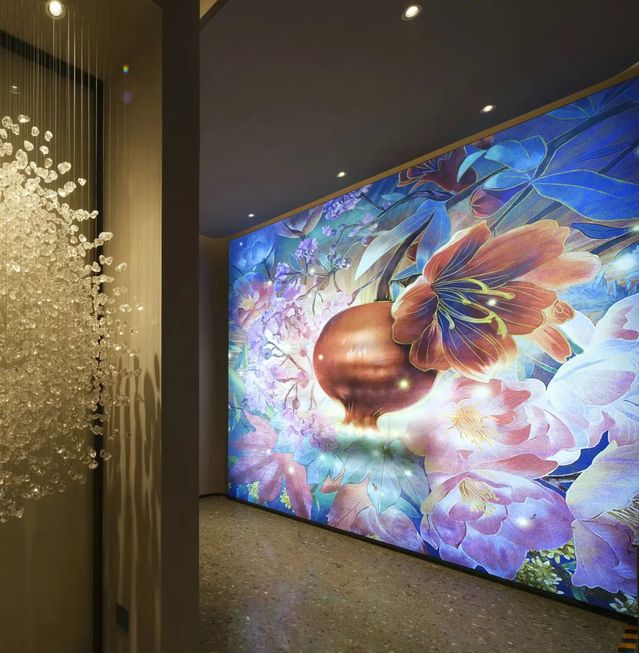 “人間歡喜事,石榴成熟時”,藝術(shù)生活館中一幅瑰麗絢爛的手繪花神圖渲染出主題氛圍,鮮花簇?fù)眍w粒飽滿石榴的畫幅,姹紫嫣紅中,將奧體公司開發(fā)的奧體新城各小區(qū)名稱中的植物元素有機(jī)組合在一起,觀眾置身其中,仿佛能聞到花的芳香、看到石榴籽的晶瑩剔透。畫面寓意著花開興隆、興旺昌盛,祝福幸福美好生活紅紅火火,也體現(xiàn)了河西集團(tuán)“開發(fā)幸福、運(yùn)營美好”的經(jīng)營理念。整幅花神圖由特邀手繪師親繪而成,十分珍貴。