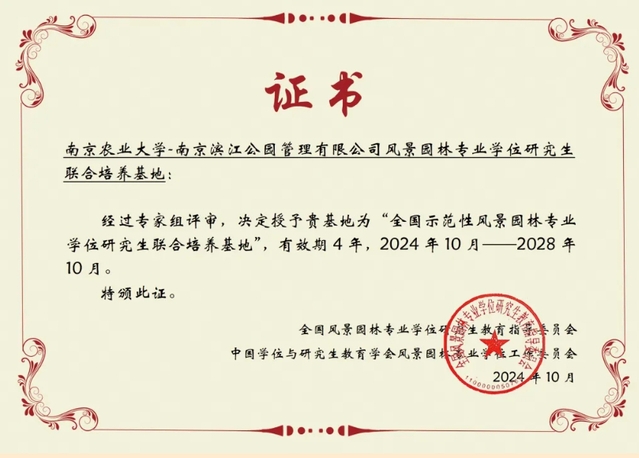 近日,全國風(fēng)景園林專業(yè)學(xué)位研究生教育指導(dǎo)委員會(huì)正式公布了2024年“全國示范性風(fēng)景園林專業(yè)學(xué)位研究生聯(lián)合培養(yǎng)基地”名單。南京濱江公園管理有限公司與南京農(nóng)業(yè)大學(xué)合作共建的“南京農(nóng)業(yè)大學(xué)—南京濱江公園管理有限公司風(fēng)景園林專業(yè)學(xué)位研究生聯(lián)合培養(yǎng)基地”,憑借卓越的聯(lián)合培養(yǎng)成效和深厚的校企合作基礎(chǔ),再次獲此資質(zhì)。