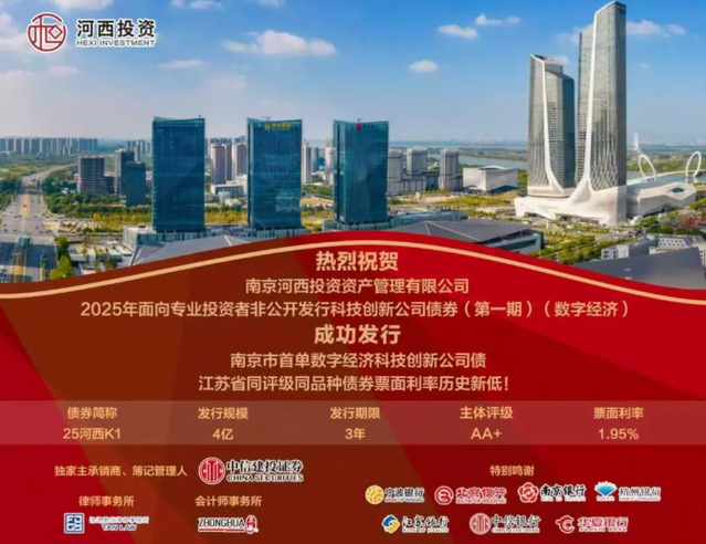 12月15日,河西集團南京河西投資資產(chǎn)管理有限公司(以下簡稱“河西投資”)2025年面向?qū)I(yè)投資者非公開發(fā)行科技創(chuàng)新公司債券(第一期)(數(shù)字經(jīng)濟)于上海證券交易所成功發(fā)行,系河西投資在債券市場的首次亮相。本次債券發(fā)行期限為3年,規(guī)模4億元,利率1.95%,為江蘇省同評級同品種債券票面利率歷史新低。