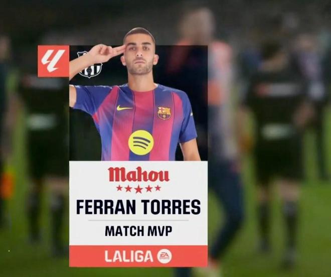 西甲第15輪,巴塞羅那客場5-3擊敗皇家貝蒂斯,此役上演帽子戲法的費蘭-托雷斯當(dāng)選西甲官方全場最佳球員。